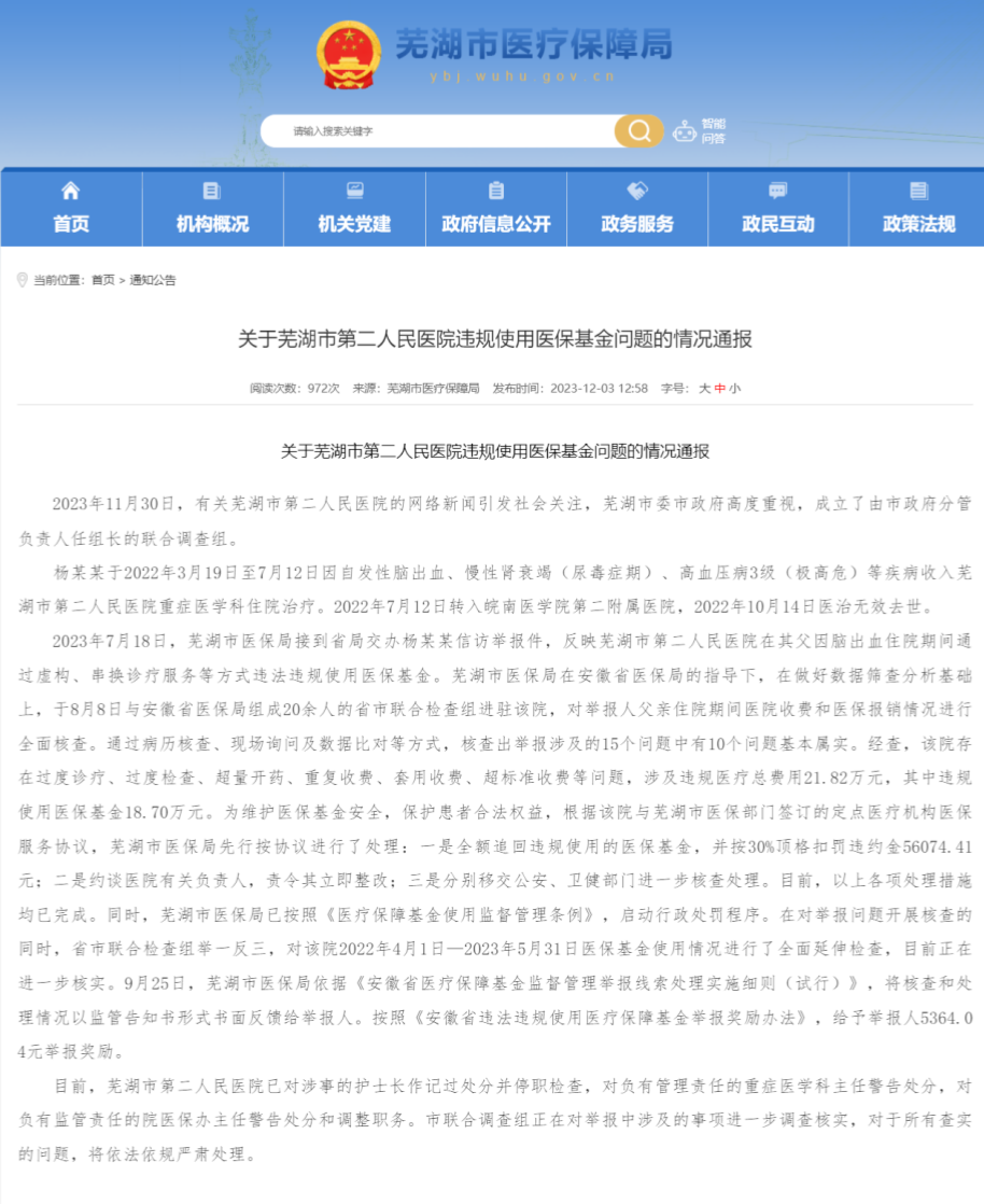 2023年7月18日,芜湖市医保局接到省局交办杨某某信访举报件,反映芜湖市第二人民医院在其父因脑出血住院期间通过虚构、串换诊疗服务等方式违法违规使用医保基金。