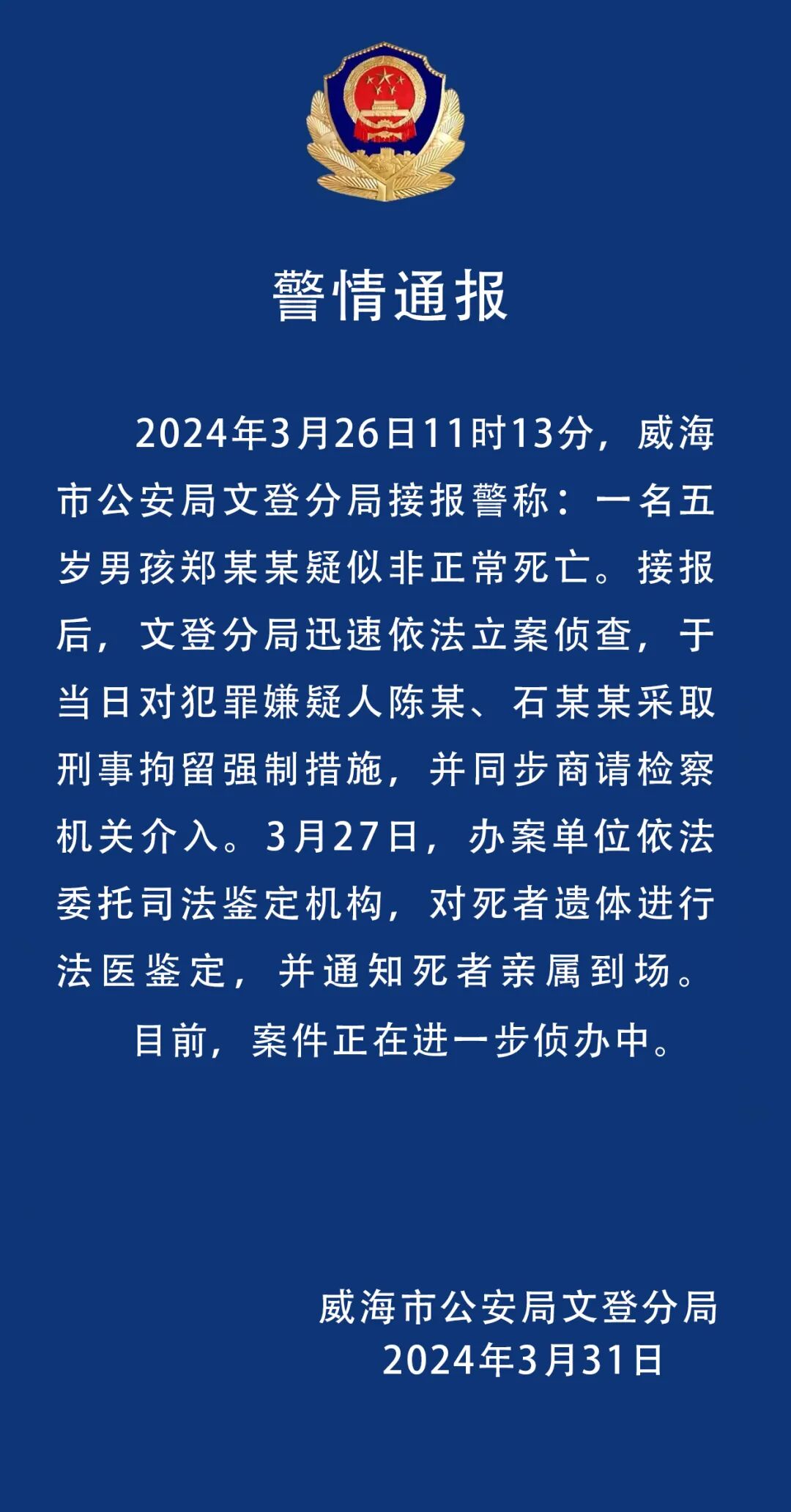 3月31日,山东威海警方回应“五岁男孩疑似非正常死亡”,犯罪嫌疑人陈某、石某某(男孩生母与其男友)已被采取刑事拘留强制措施。