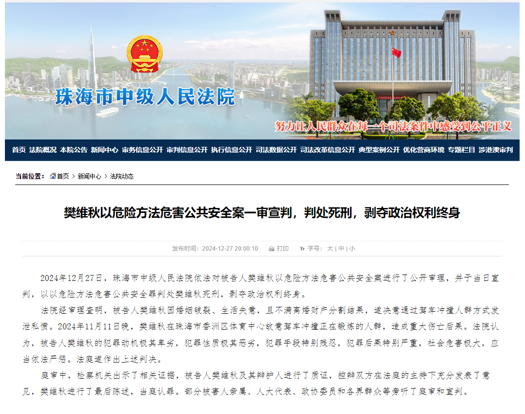 2024年12月27日,广东省珠海市中级法院依法对被告人樊维秋以危险方法危害公共安全案进行了公开审理,并于当日宣判,以以危险方法危害公共安全罪判处樊维秋死刑,剥夺政治权利终身。法院经审理查明,被告人樊维秋因婚姻破裂、生活失意,且不满离婚财产分割结果,遂决意通过驾车冲撞人群方式发泄私愤。2024年11月11日晚,樊维秋在珠海市香洲区体育中心故意驾车冲撞正在锻炼的人群,造成重大伤亡后果。法院认为,被告人樊维秋的犯罪动机极其卑劣,犯罪性质极其恶劣,犯罪手段特别残忍,犯罪后果特别严重,社会危害极大,应当依法严惩。法庭遂作出上述判决。庭审中,检察机关出示了相关证据,被告人樊维秋及其辩护人进行了质证,控辩双方在法庭的主持下充分发表了意见,樊维秋进行了最后陈述,当庭认罪。部分被害人亲属、人大代表、政协委员和各界群众等旁听了庭审和宣判。