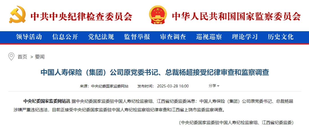 据中央纪委国家监委网站3月28日消息,中国人寿保险(集团)公司原党委书记、总裁杨超涉嫌严重违纪违法,目前正接受中央纪委国家监委驻中国人寿纪检监察组纪律审查和江西省上饶市监委监察调查。