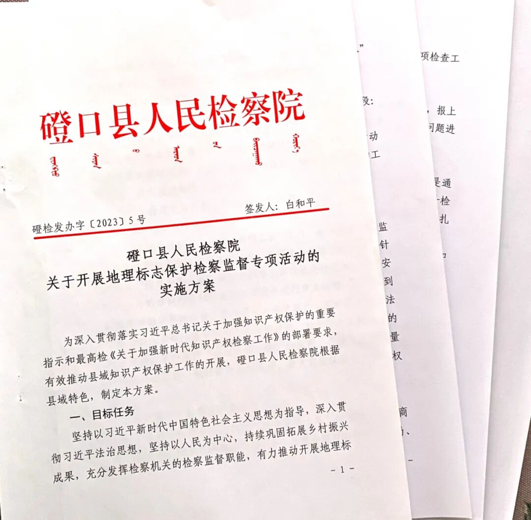 为做好地理标志保护工作,找准地理标志商标检察保护的重点领域、重点产品、重点工作,确立常态化保护机制,磴口县人民检察院制定了《磴口县人民检察院开展地理标志保护检察监督专项活动实施方案》,成立了地理标志保护检察监督专项活动领导小组及办公室,明确了相关部门的任务和重点,夯实了责任和目标,形成了全院一盘棋的格局。