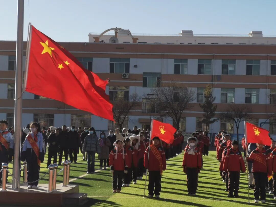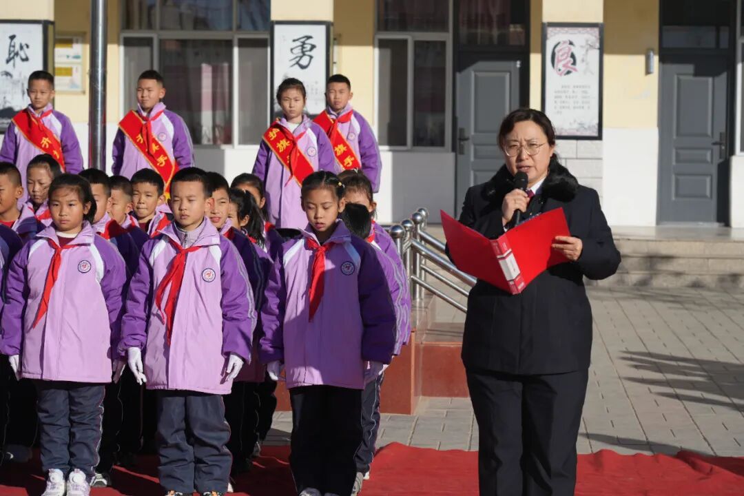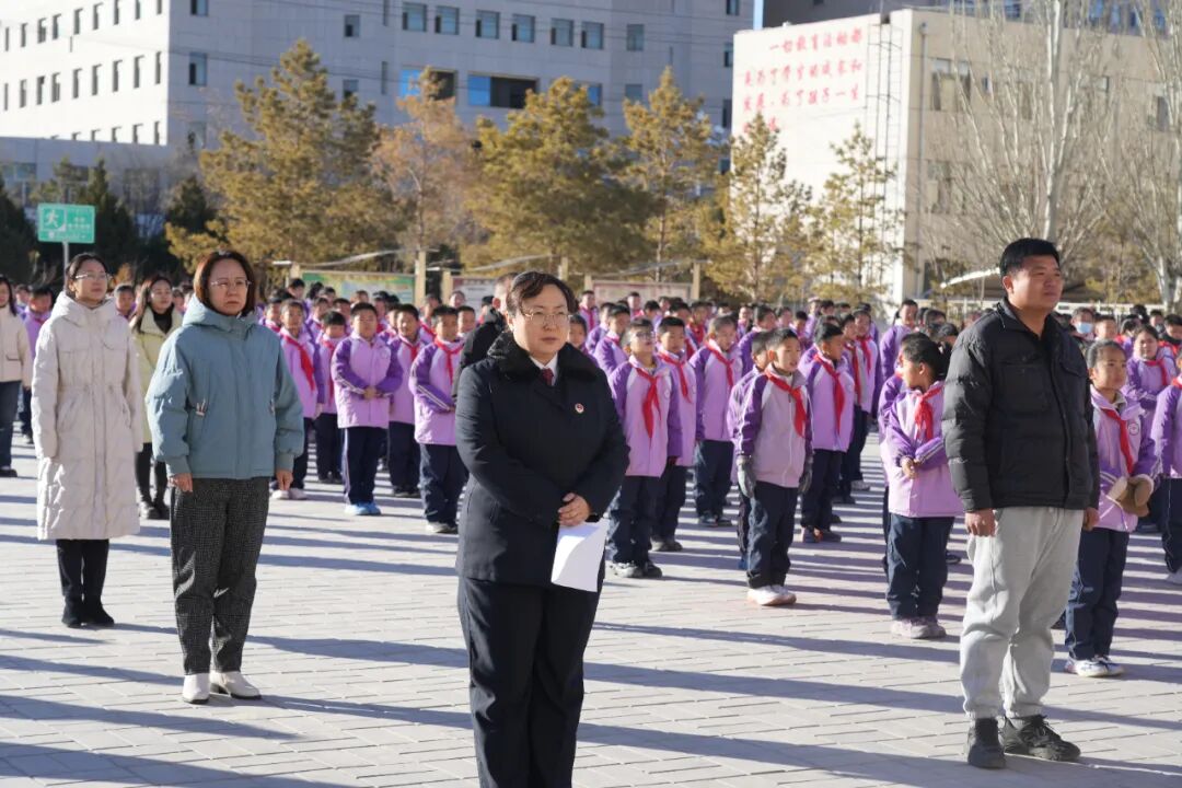 当日清晨,阳光洒满校园,小学校园内全体师生整齐列队,庄严肃立。磴口县人民检察院的宣传员同志迈着坚定的步伐走向国旗台。在激昂的国歌声中,鲜艳的五星红旗冉冉升起,迎风飘扬。全体师生行注目礼,高唱国歌,现场气氛庄重而热烈。
