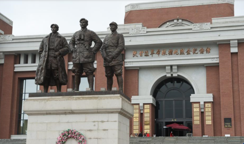 照金广场中央,矗立着一组雕像——中间是刘志丹同志,两旁穿大衣的是谢子长同志、戴军帽的是习仲勋同志。雕像背后,便是陕甘边革命根据地照金纪念馆。