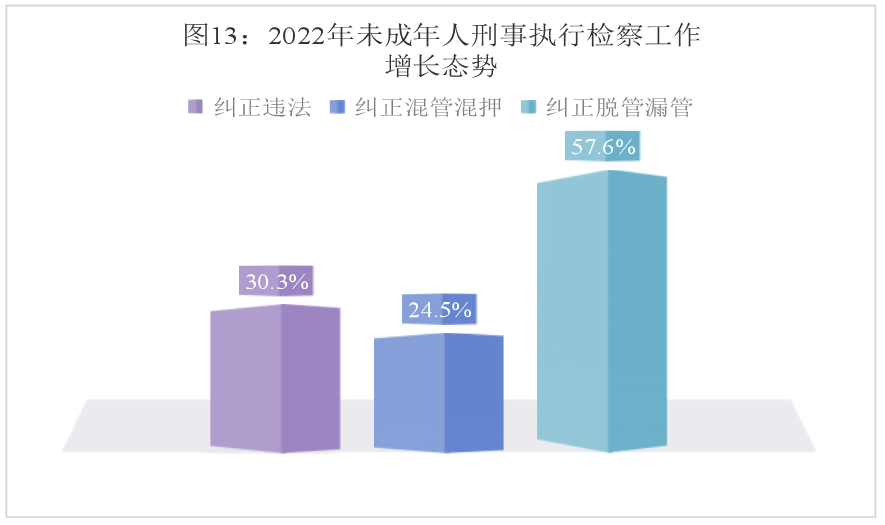 (6)未成年人刑事执行检察监督力度持续加大。2022年,检察机关依法对涉罪未成年人开展羁押必要性审查,减少对涉罪未成年人非必要羁押。侦查阶段提出释放或变更强制措施建议被采纳2008人;审查起诉阶段直接释放或者变更强制措施1746人;审判阶段提出释放或变更强制措施建议被采纳288人。针对看守所监管未成年人活动提出检察建议272件,同比上升30.8%;纠正违法2660件,同比上升30.3%;纠正混管混押3415人,同比上升24.5%。针对未成年犯管教所监管活动提出检察建议32件,同比上升77.8%;纠正减刑、假释、暂予监外执行不当345人。针对未成年人社区矫正活动纠正脱管漏管320人,同比上升57.6%;纠正收监执行不当144人,同比上升67.4%;纠正与成年犯混合执行社区矫正637人,同比上升1.09倍。