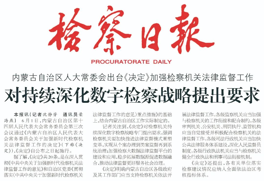 6月1日,内蒙古自治区第十四届人民代表大会常务委员会第三次会议通过《内蒙古自治区人民代表大会常务委员会关于加强新时代检察机关法律监督工作的决定》(下称《决定》),《决定》自公布之日起施行。