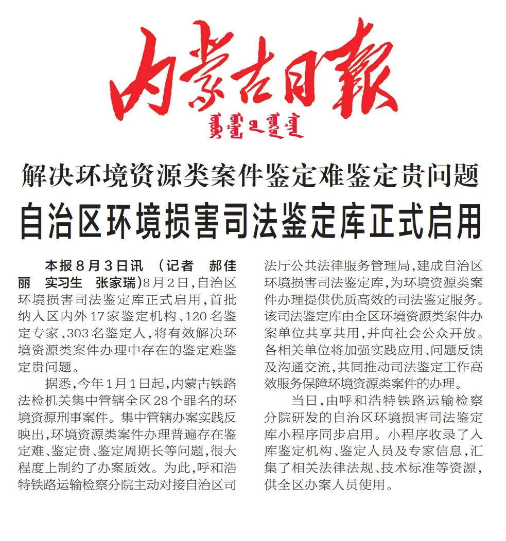 当日,由呼和浩特铁路运输检察分院研发的自治区环境损害司法鉴定库小程序同步启用。小程序收录了入库鉴定机构、鉴定人员及专家信息,汇集了相关法律法规、技术标准等资源,供全区办案人员使用。