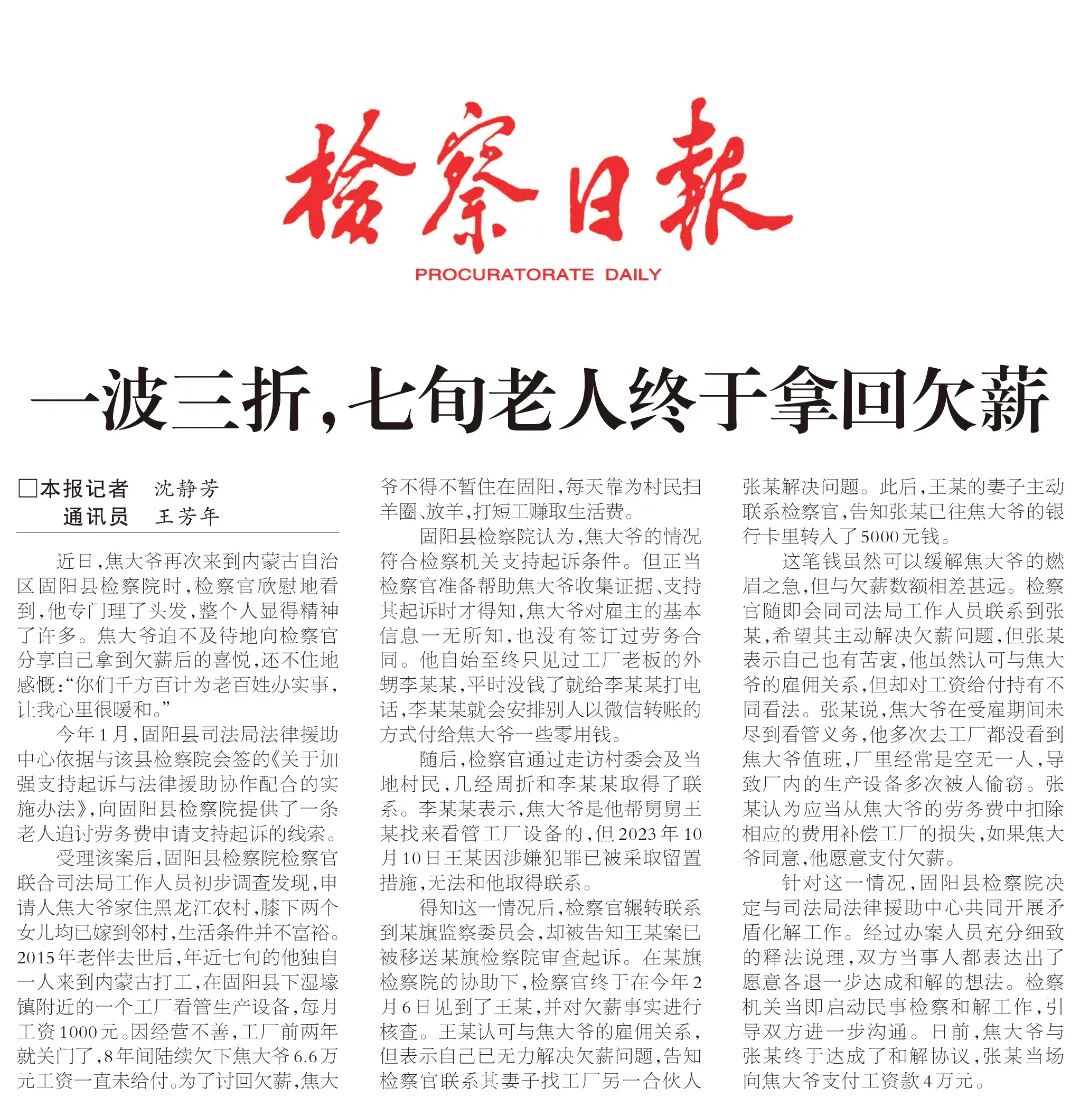 近日,焦大爷再次来到内蒙古自治区固阳县检察院时,检察官欣慰地看到,他专门理了头发,整个人显得精神了许多。焦大爷迫不及待地向检察官分享自己拿到欠薪后的喜悦,还不住地感慨:“你们千方百计为老百姓办实事,让我心里很暖和。”