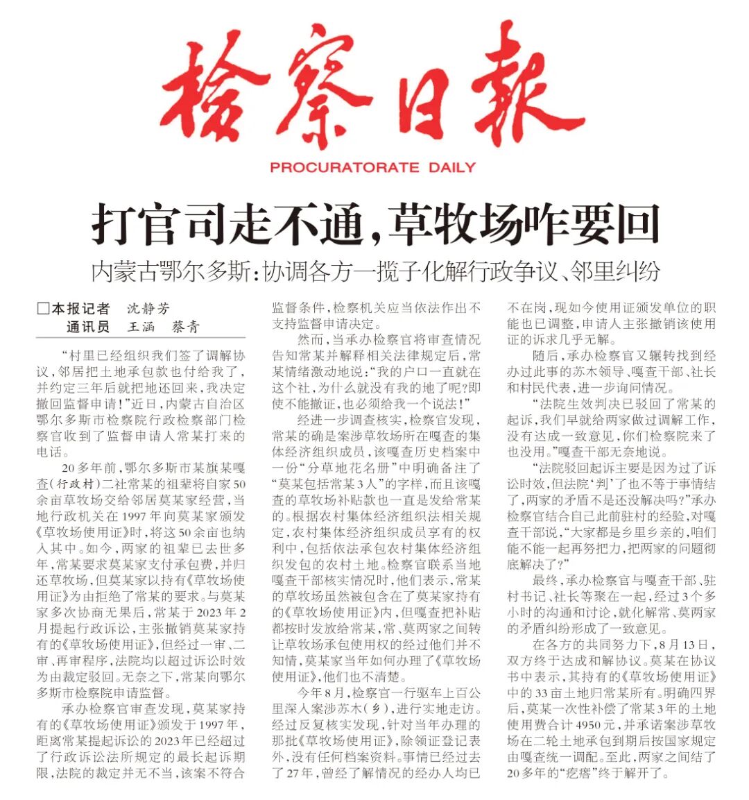 “村里已经组织我们签了调解协议,邻居把土地承包款也付给我了,并约定三年后就把地还回来,我决定撤回监督申请!”近日,内蒙古自治区鄂尔多斯市检察院行政检察部门检察官收到了监督申请人常某打来的电话。