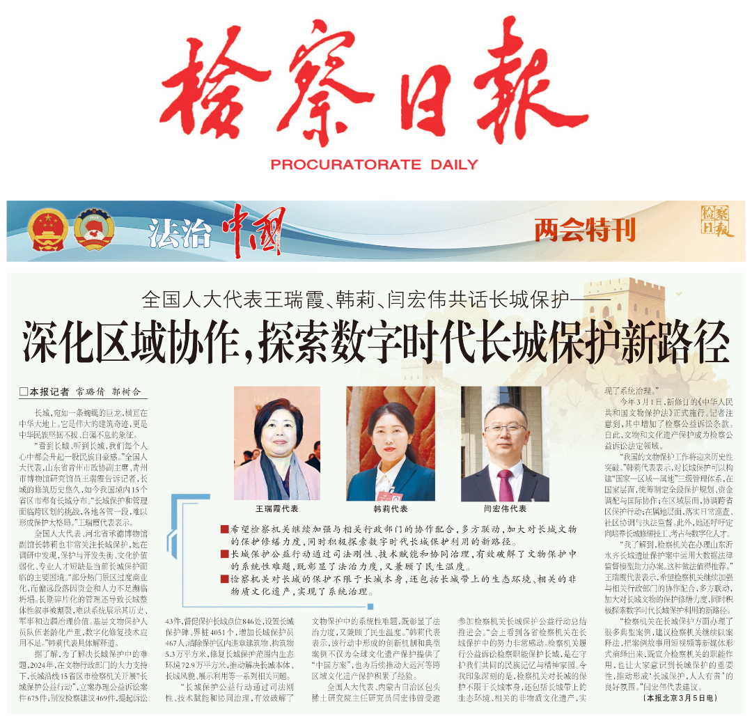 “我了解到,检察机关在办理山东沂水齐长城遗址保护案中运用大数据法律监督模型助力办案。这种做法值得推荐。”王瑞霞代表表示,希望检察机关继续加强与相关行政部门的协作配合,多方联动,加大对长城文物的保护修缮力度,同时积极探索数字时代长城保护利用的新路径。