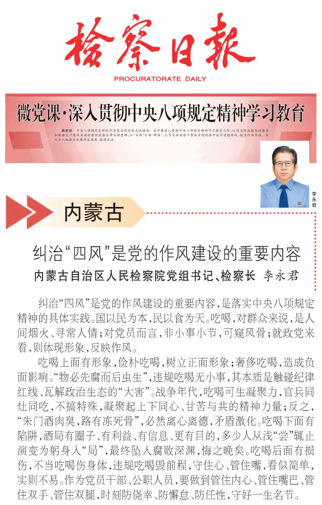 纠治“四风”是党的作风建设的重要内容,是落实中央八项规定精神的具体实践。国以民为本,民以食为天。吃喝,对群众来说,是人间烟火、寻常人情;对党员而言,非小事小节,可窥风骨;就政党来看,则体现形象,反映作风。