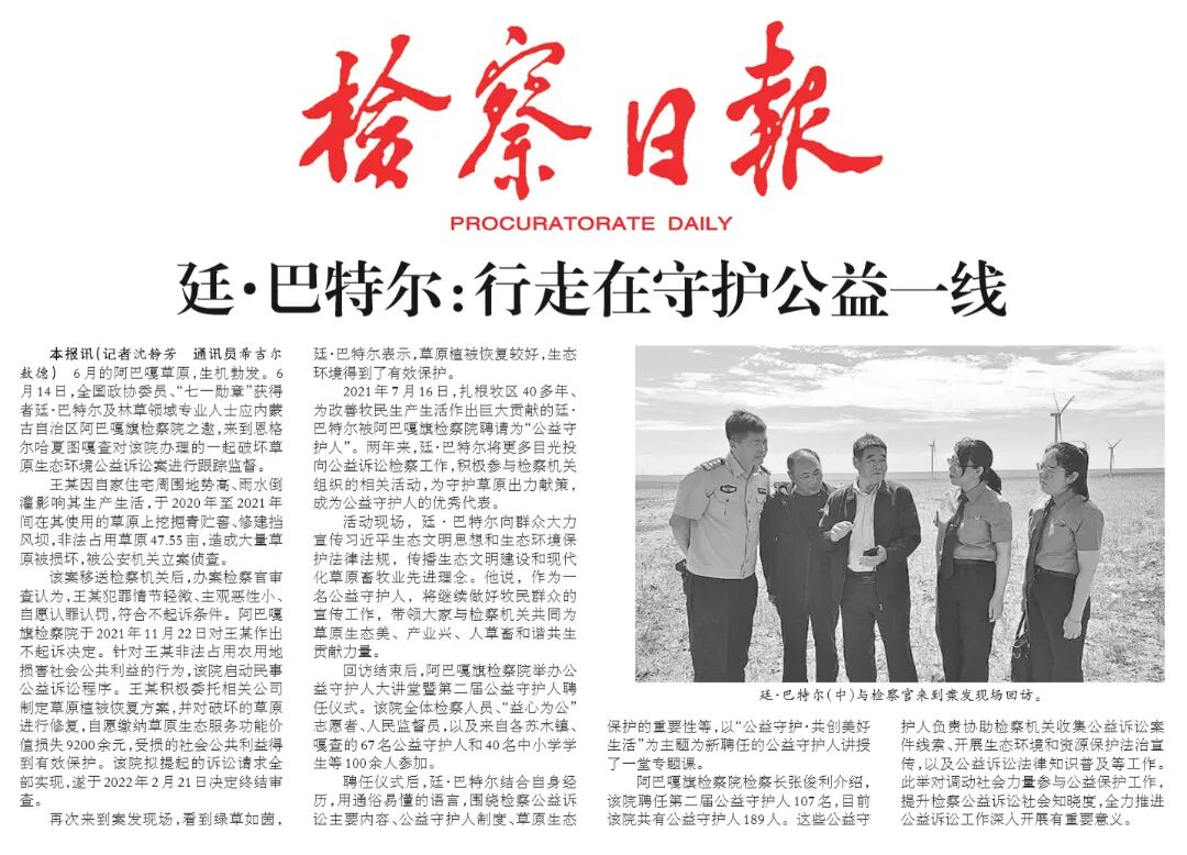 2021年7月16日,扎根牧区40多年、为改善牧民生产生活作出巨大贡献的廷·巴特尔被阿巴嘎旗检察院聘请为“公益守护人”。两年来,廷·巴特尔将更多目光投向公益诉讼检察工作,积极参与检察机关组织的相关活动,为守护草原出力献策,成为公益守护人的优秀代表。