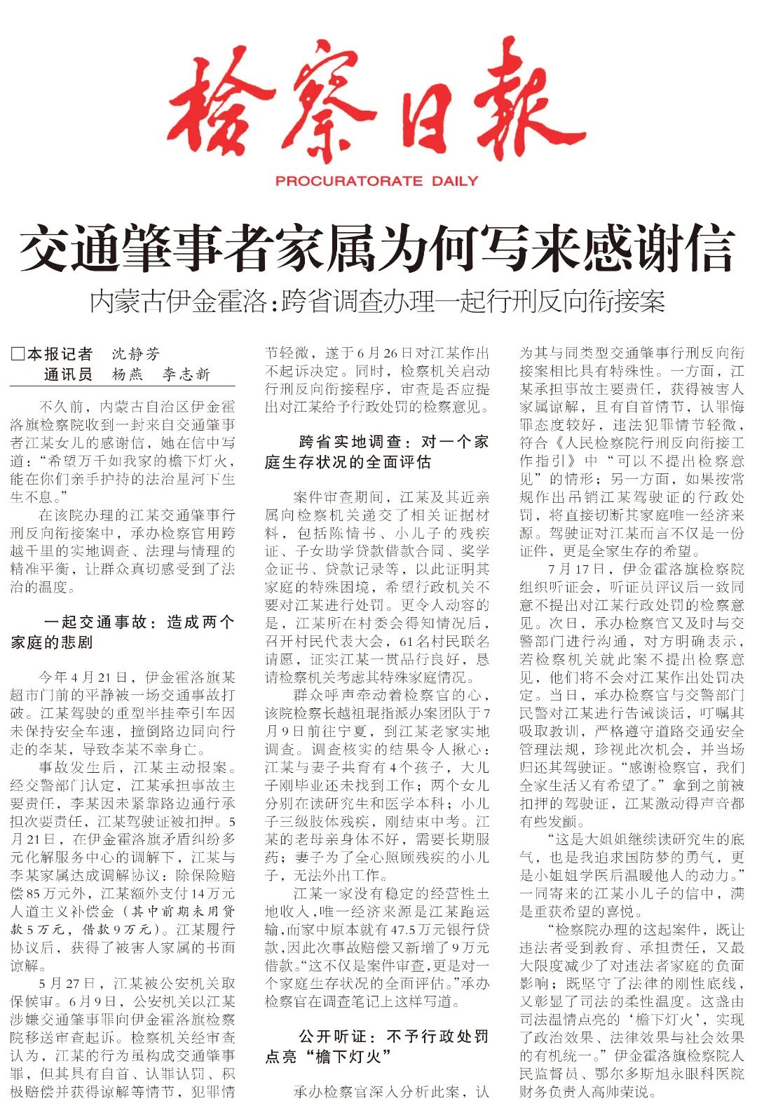 不久前,内蒙古自治区伊金霍洛旗检察院收到一封来自交通肇事者江某女儿的感谢信,她在信中写道:“希望万千如我家的檐下灯火,能在你们亲手护持的法治星河下生生不息。”