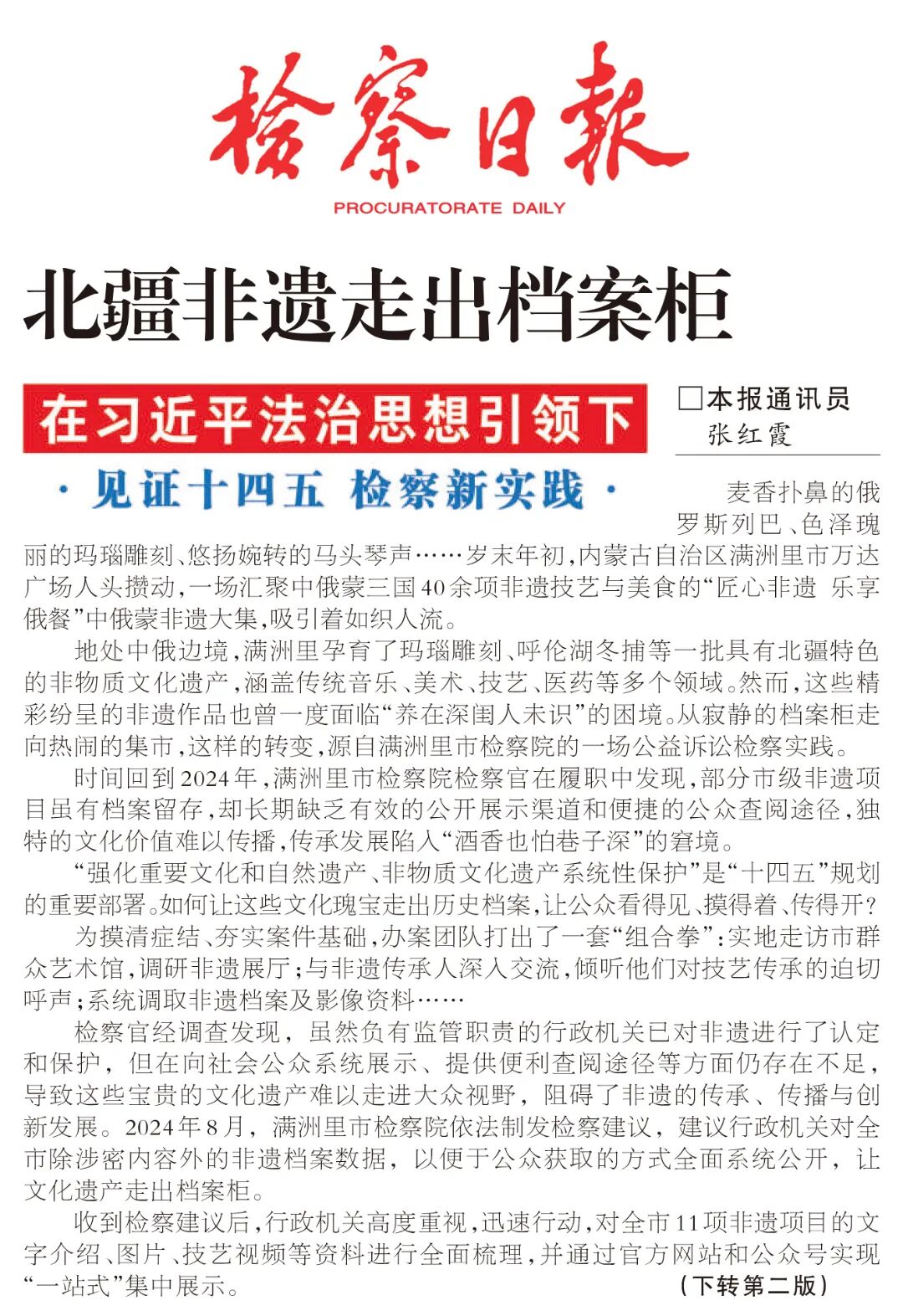 检察官经调查发现,虽然负有监管职责的行政机关已对非遗进行了认定和保护,但在向社会公众系统展示、提供便利查阅途径等方面仍存在不足,导致这些宝贵的文化遗产难以走进大众视野,阻碍了非遗的传承、传播与创新发展。2024年8月,满洲里市检察院依法制发检察建议,建议行政机关对全市除涉密内容外的非遗档案数据,以便于公众获取的方式全面系统公开,让文化遗产走出档案柜。