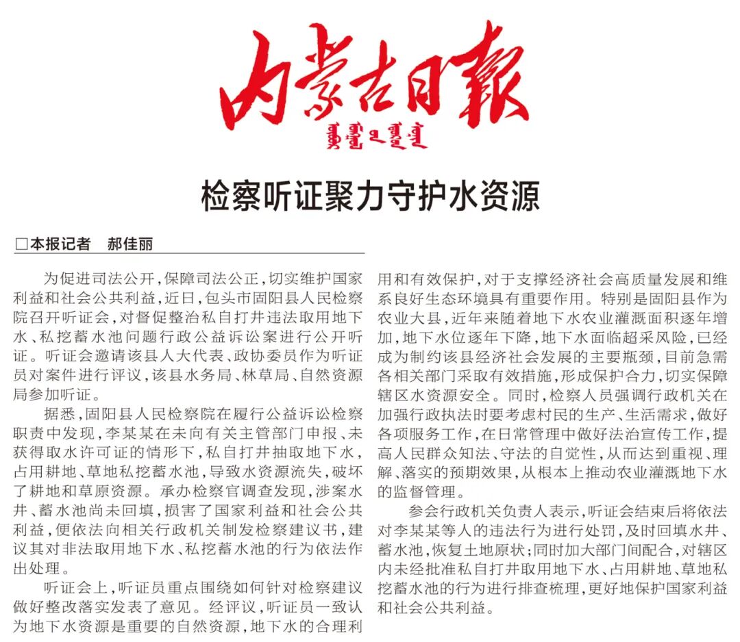 为促进司法公开,保障司法公正,切实维护国家利益和社会公共利益,近日,包头市固阳县人民检察院召开听证会,对督促整治私自打井违法取用地下水、私挖蓄水池问题行政公益诉讼案进行公开听证。听证会邀请该县人大代表、政协委员作为听证员对案件进行评议,该县水务局、林草局、自然资源局参加听证。