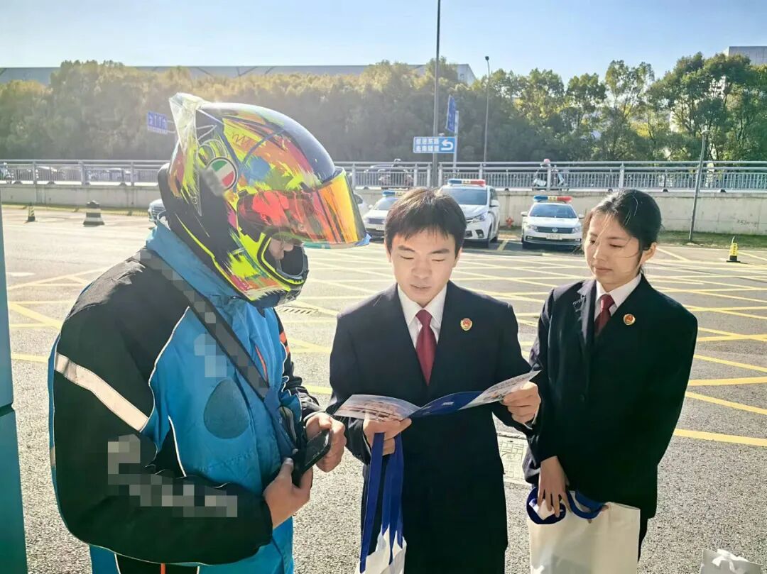 江苏省昆山市检察院检察官向外卖骑手开展公益诉讼法治宣传。
