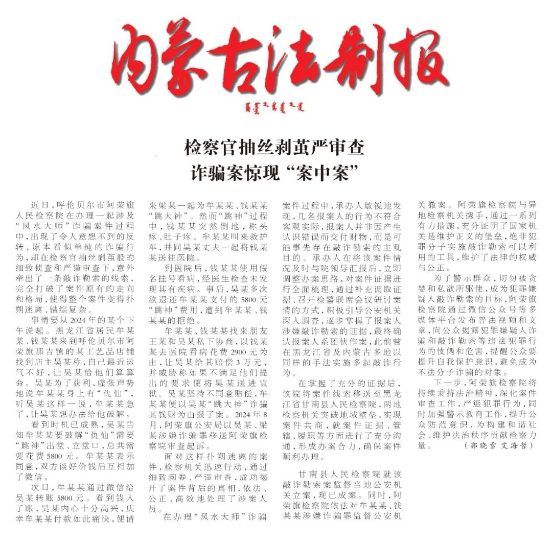 近日,呼伦贝尔市阿荣旗检察院在办理一起涉及“风水大师”诈骗案件过程中,出现了令人意想不到的反转,原本看似单纯的诈骗行为,却在检察人员抽丝剥茧般的细致侦查和严谨审查下,意外牵出了一条敲诈勒索的线索,完全打破了案件原有的走向和格局,使得整个案件变得扑朔迷离、错综复杂。