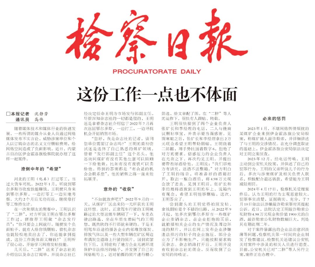 随着媒体技术和媒体行业的快速发展,一些所谓的媒介从业人员通过网络媒体发布不实言论,威胁涉案单位和个人以订购杂志的名义支付删帖费用,给网络空间造成了负面影响。近日,内蒙古自治区伊金霍洛旗检察院就办理了这样一起案件。