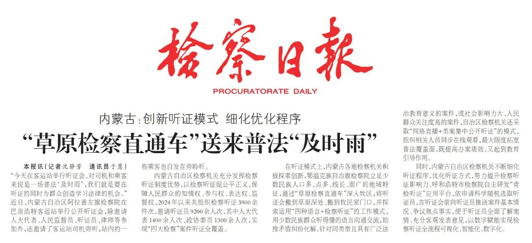 在听证模式上,内蒙古各地检察机关积极探索创新。鄂温克族自治旗检察院立足少数民族人口多,点多、线长、面广的地域特征,通过“草原检察直通车”深入牧区,将听证会搬到草原深处、搬到牧民家门口,并探索运用“四种语言+检察听证”的工作模式,用少数民族群众听得懂的语言沟通交流,助推矛盾纠纷化解。针对同类型且具有广泛法治教育意义的案件,或社会影响力大、人民群众关注度高的案件,自治区检察机关还采取“网络直播+类案集中公开听证”的模式,组织相关人员同步在线观看,最大限度拓宽普法覆盖面,既提高办案质效,又起到教育引导作用。
