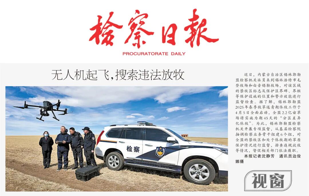 据了解,锡林郭勒盟2025年春季牧草返青期休牧工作于4月5日全面启动,全盟2.2亿亩草场将实施为期45天的“分区差异化休牧”。为此,锡林郭勒盟检察机关开展专项监督,从基层检察院抽调检察业务骨干组建6个组,对全盟的禁牧区和处于休牧期的草原保护情况进行监督,排查违规放牧等情况,督促相关部门依法履职。
