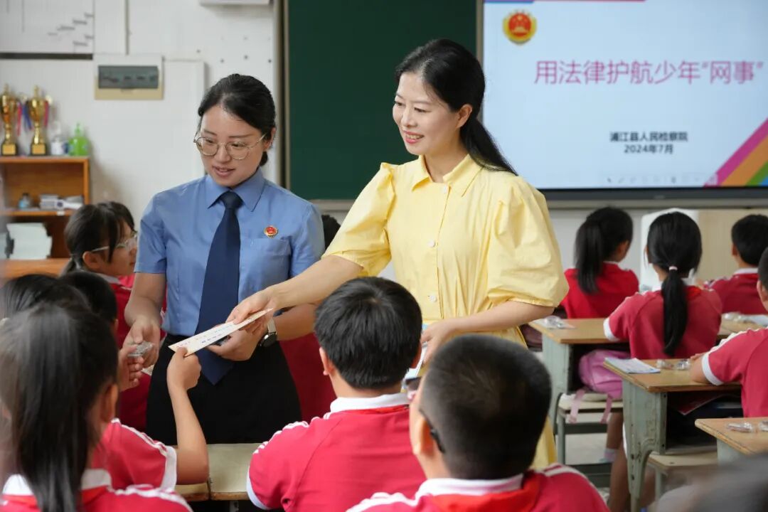 2024年7月1日,祝响响代表和浦江县检察院检察官一起为该县小学生上法治课,引导学生暑期安全用网。