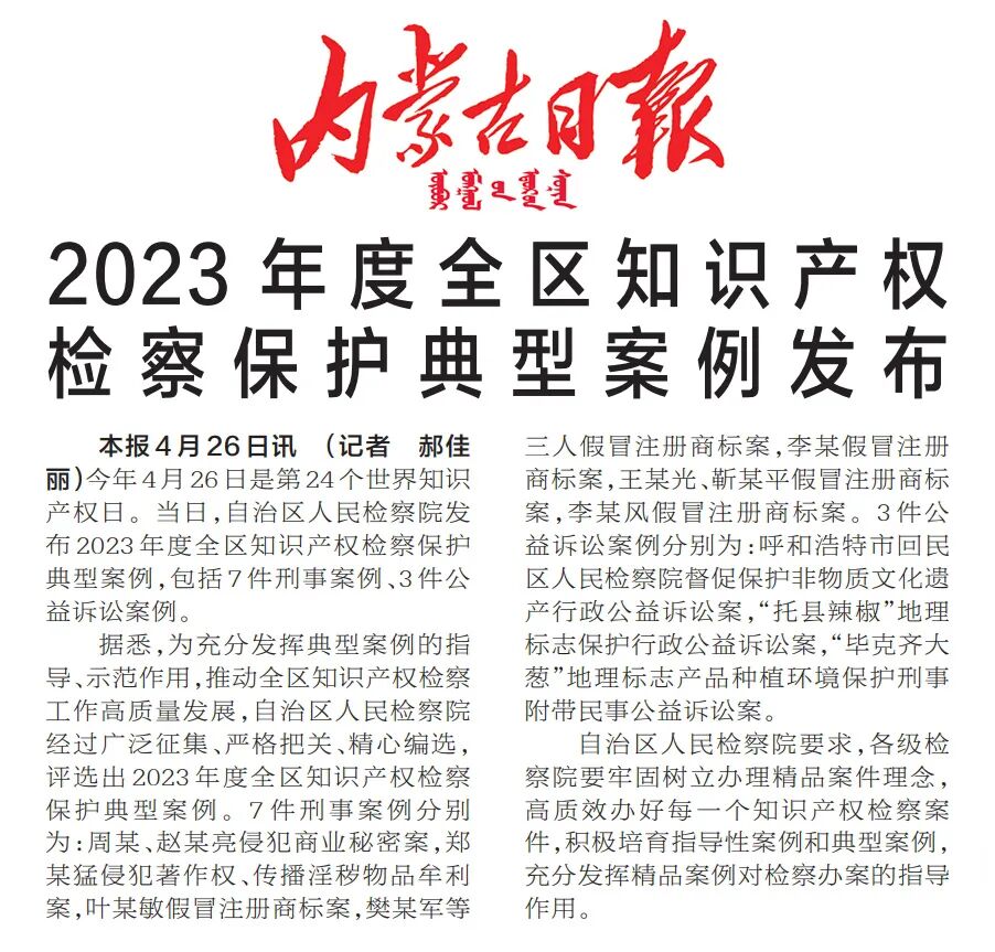 今年4月26日是第24个世界知识产权日。当日,自治区人民检察院发布2023年度全区知识产权检察保护典型案例,包括7件刑事案例、3件公益诉讼案例。