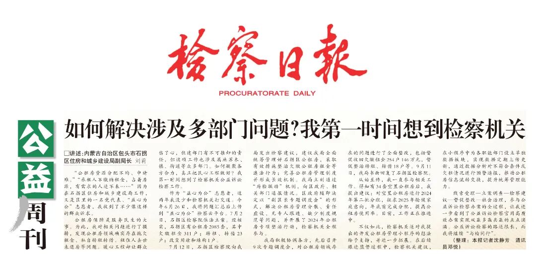 公租房保障是服务民生的大事。为此,我对相关问题进行了摸排,发现公租房领域确实存在拖欠租金、私自转租转借、租住人去世未退房等问题。暖心工程却让群众伤了心,住建部门有不可推卸的责任,但这项工作也涉及属地苏木、镇、街道等众多部门。如何凝聚各方合力,真正把民心工程做好?我第一时间想到了检察机关公益诉讼检察工作。