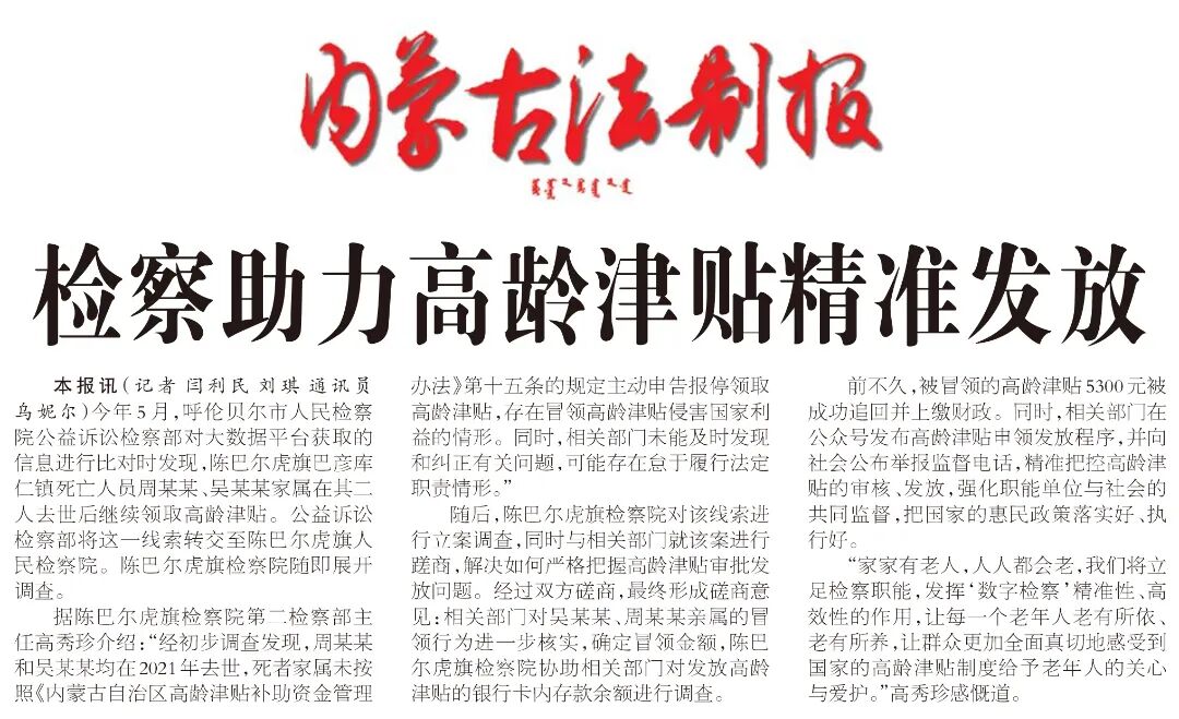 今年5月,呼伦贝尔市检察院公益诉讼检察部对大数据平台获取的信息进行比对时发现,陈巴尔虎旗巴彦库仁镇死亡人员周某某、吴某某家属在其二人去世后继续领取高龄津贴。公益诉讼检察部将这一线索转交至陈巴尔虎旗检察院。陈巴尔虎旗检察院随即展开调查。
