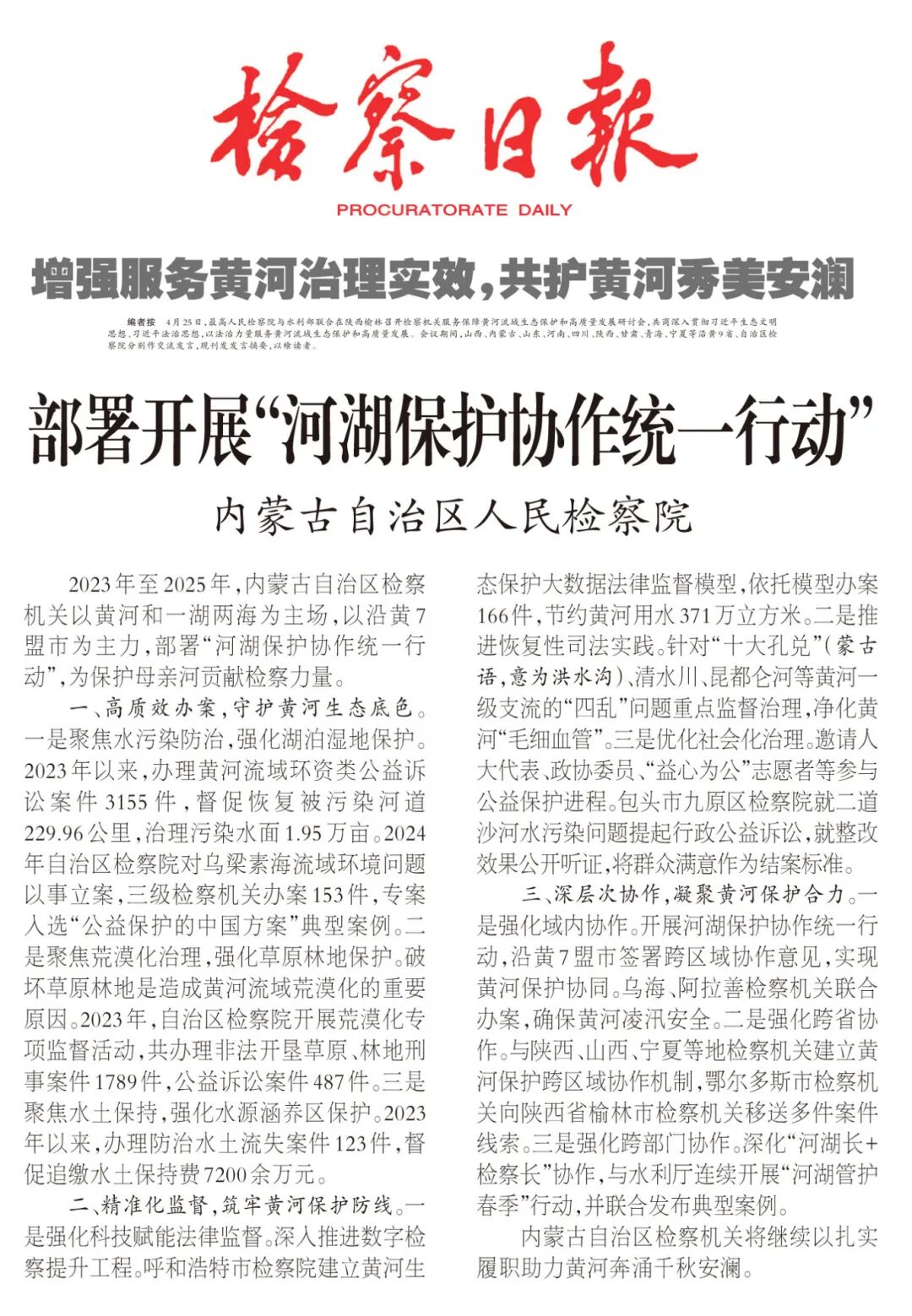 2023年至2025年,内蒙古自治区检察机关以黄河和一湖两海为主场,以沿黄7盟市为主力,部署“河湖保护协作统一行动”,为保护母亲河贡献检察力量。