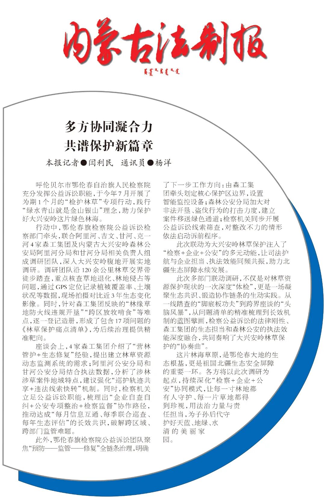 这片林海草原,是鄂伦春大地的生态根基,更是祖国北疆生态安全屏障的重要一环。各方将以此次调研为起点,持续深化“检察+企业+公安”协同模式,让每一寸林地都有人守护、每一片草地都得到珍视,用法治力量与责任担当,为子孙后代守护好天蓝、地绿、水清的美丽家园。