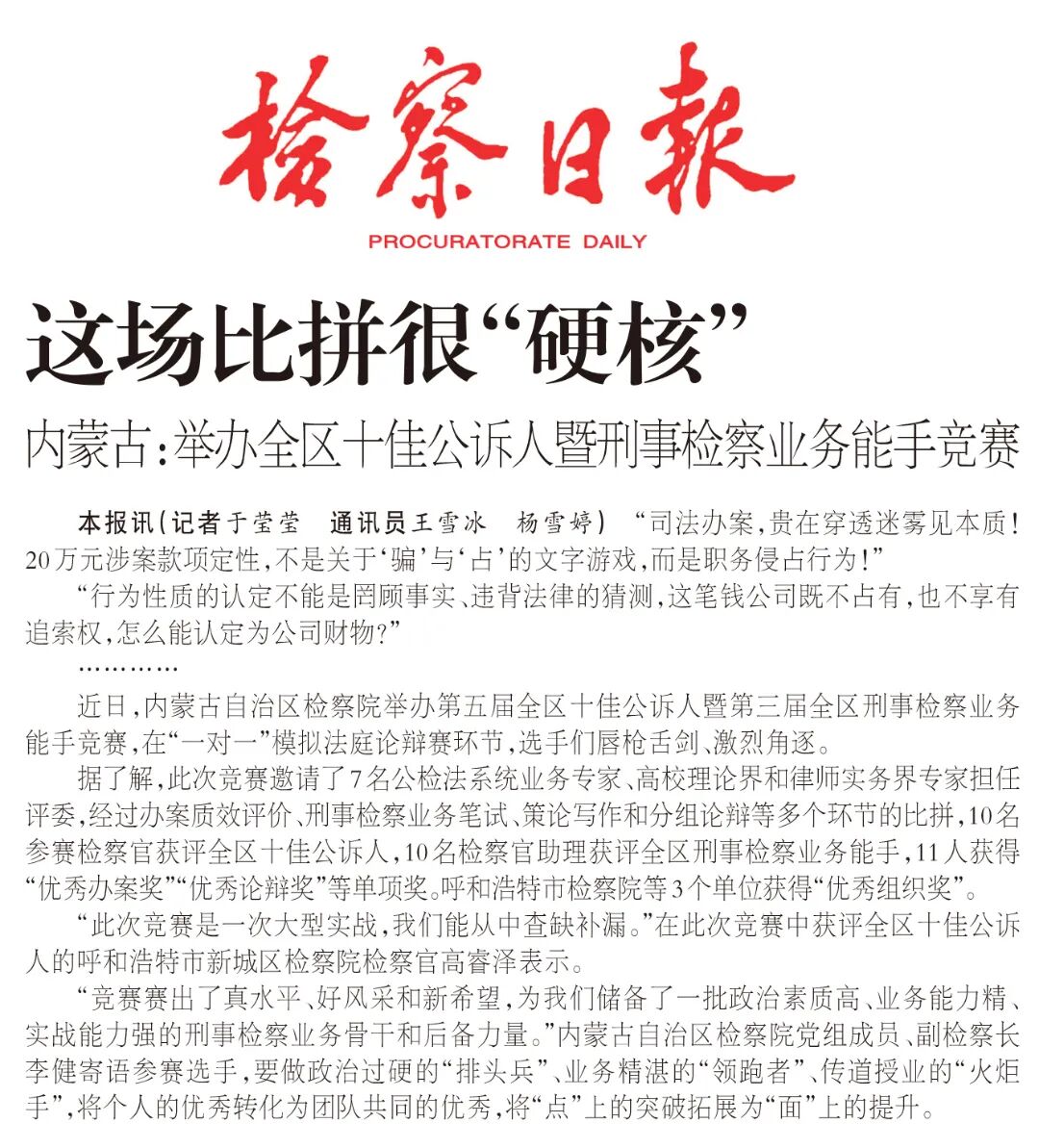 “此次竞赛是一次大型实战,我们能从中查缺补漏。”在此次竞赛中获评全区十佳公诉人的呼和浩特市新城区检察院检察官高睿泽表示。