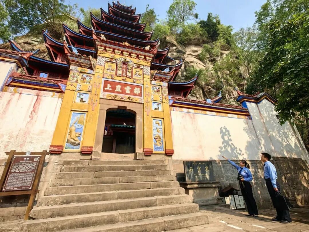 重庆市忠县人民检察院检察官现场查看石宝寨寨门。