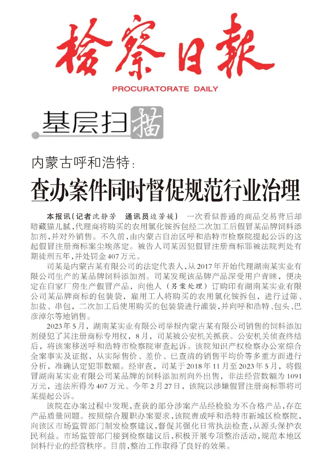 2023年5月,湖南某实业有限公司举报内蒙古某有限公司销售的饲料添加剂侵犯了其注册商标专用权,8月,司某被公安机关抓获。公安机关侦查终结后,将该案移送呼和浩特市检察院审查起诉。该院知识产权检察办公室综合全案事实及证据,从实际售价、差价、已查清的销售平均价等多重方面进行分析,准确认定犯罪数额。经审查,司某于2018年11月至2023年5月,将假冒湖南某实业有限公司某品牌的饲料添加剂向外出售,非法经营数额为1091万元,违法所得为407万元。今年2月27日,该院以涉嫌假冒注册商标罪将司某提起公诉。