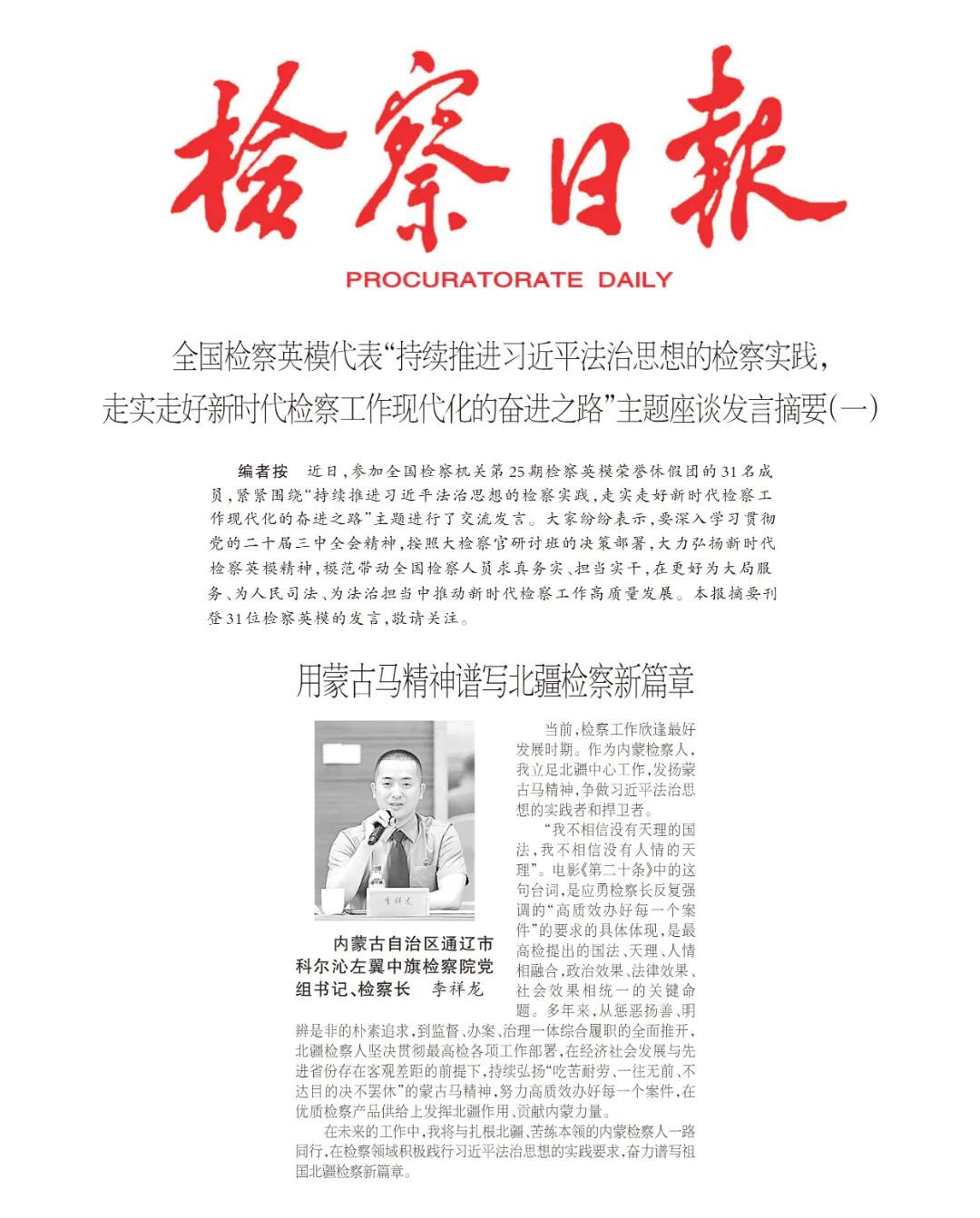 近日,参加全国检察机关第25期检察英模荣誉休假团的31名成员,紧紧围绕“持续推进习近平法治思想的检察实践,走实走好新时代检察工作现代化的奋进之路”主题进行了交流发言。大家纷纷表示,要深入学习贯彻党的二十届三中全会精神,按照大检察官研讨班的决策部署,大力弘扬新时代检察英模精神,模范带动全国检察人员求真务实、担当实干,在更好为大局服务、为人民司法、为法治担当中推动新时代检察工作高质量发展。本报摘要刊登31位检察英模的发言,以下为内蒙古自治区通辽市科尔沁左翼中旗检察院党组书记、检察长李祥龙的发言节选。