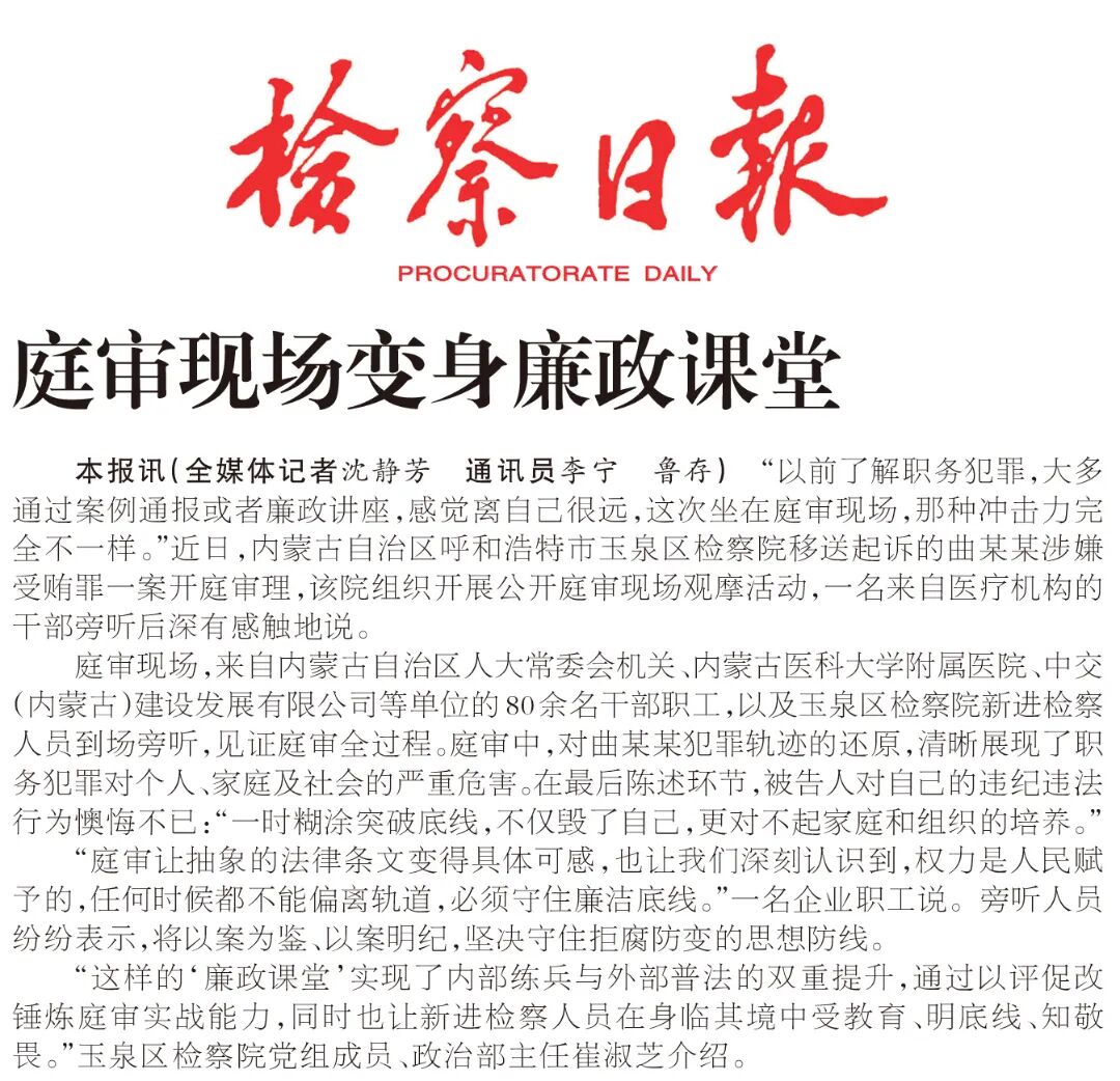 “以前了解职务犯罪,大多通过案例通报或者廉政讲座,感觉离自己很远,这次坐在庭审现场,那种冲击力完全不一样。”近日,内蒙古自治区呼和浩特市玉泉区检察院移送起诉的曲某某涉嫌受贿罪一案开庭审理,该院组织开展公开庭审现场观摩活动,一名来自医疗机构的干部旁听后深有感触地说。