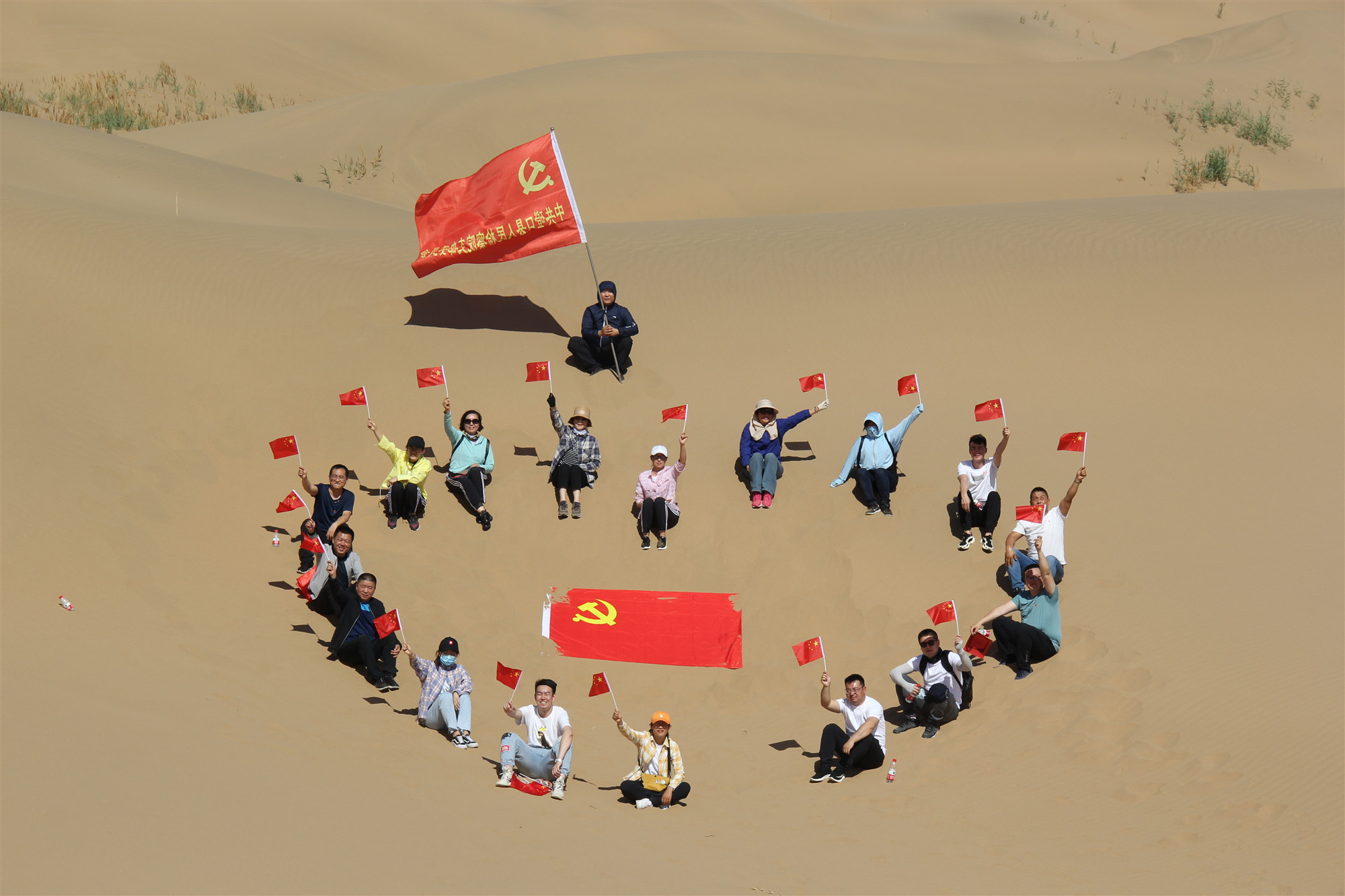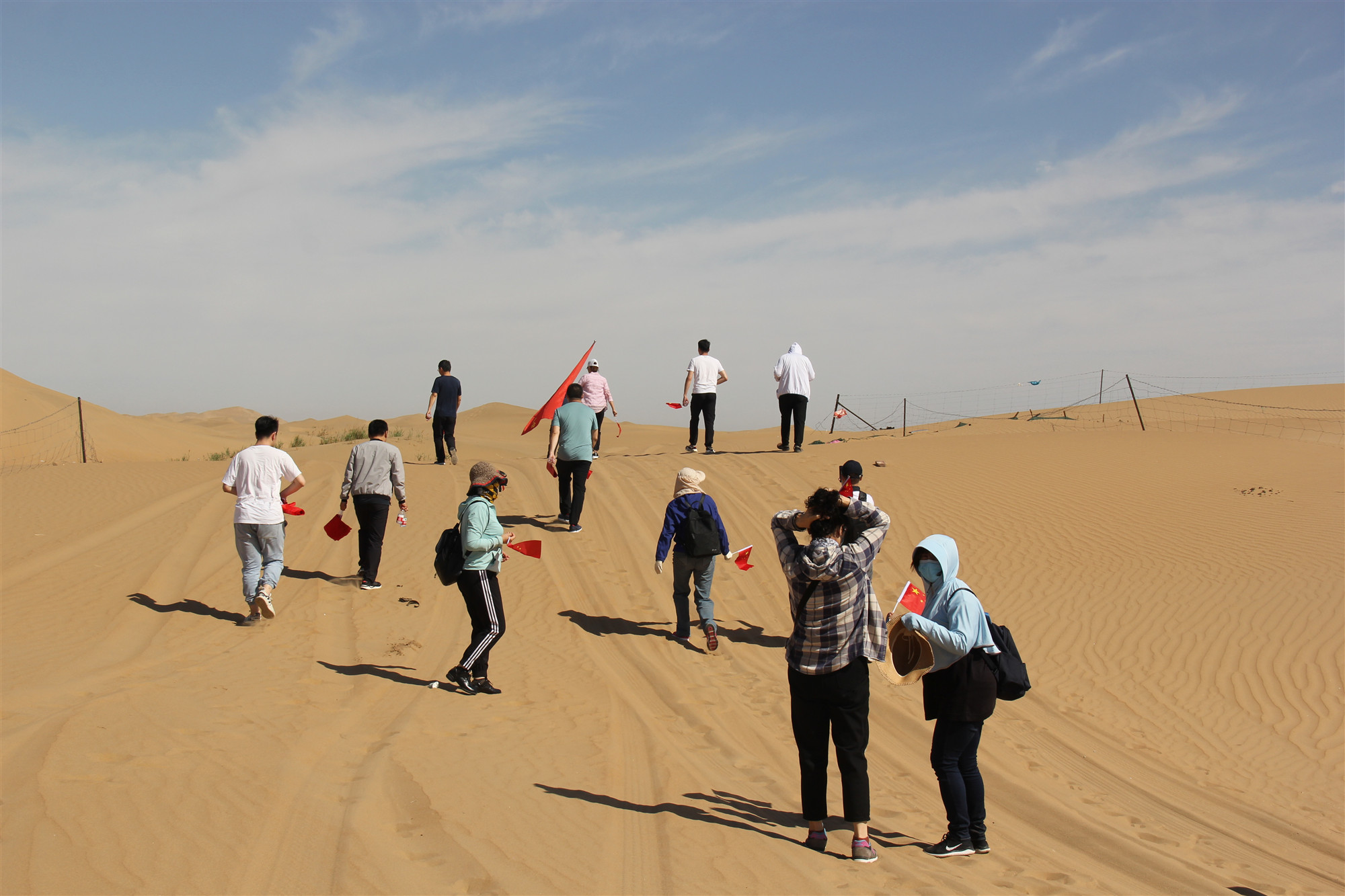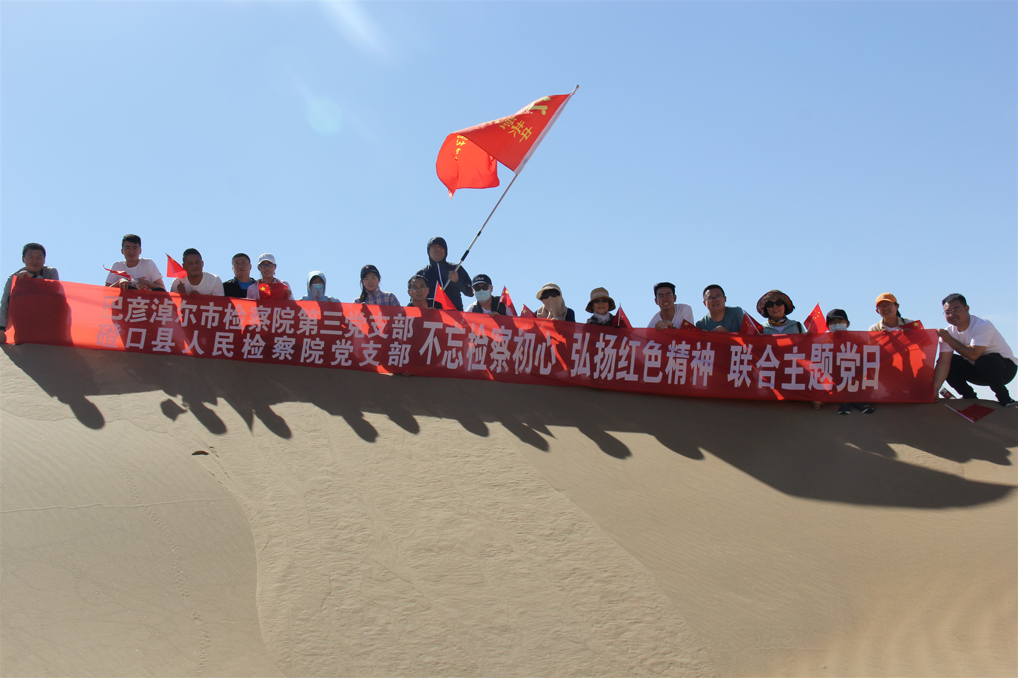 一早,两级院30余名党员干警共同抵达穿沙公路进行徒步穿沙活动,头顶烈日徒步穿越沙漠,吃力的行走,感受身处沙漠深处的荒芜,见识乌兰布和大沙漠的雄浑与壮观,体验了大自然所赋予人们的无穷力量。