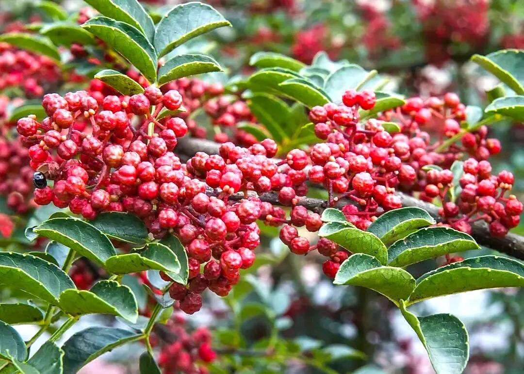 眼下正值丰收时节,四川省汉源县清溪镇同心村的两棵花椒古树果实盈枝。