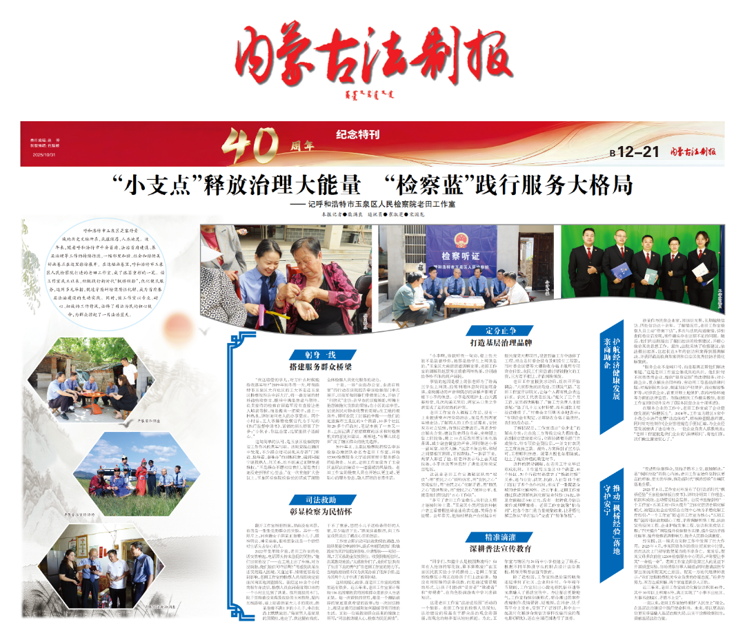 呼和浩特市玉泉区是塞外青城的历史文脉所在,底蕴深厚,人杰地灵。近年来,随着呼和浩特市平安首府、法治首府建设、基层治理等工作的持续推进,一幅邻里和睦、社会和谐的美好画卷正在这里徐徐展开。在这幅画卷里,呼和浩特市玉泉区检察院打造的老田工作室,成了浓墨重彩的一笔。该工作室成立以来,积极践行新时代“枫桥经验”,优化便民服务,运用多元举措,促进矛盾纠纷实质性化解,成为首府基层法治建设的生动实践。同时,该工作室以专业、耐心、细致的工作作风,诠释了司法为民的初心使命,为群众撑起了一片法治蓝天。